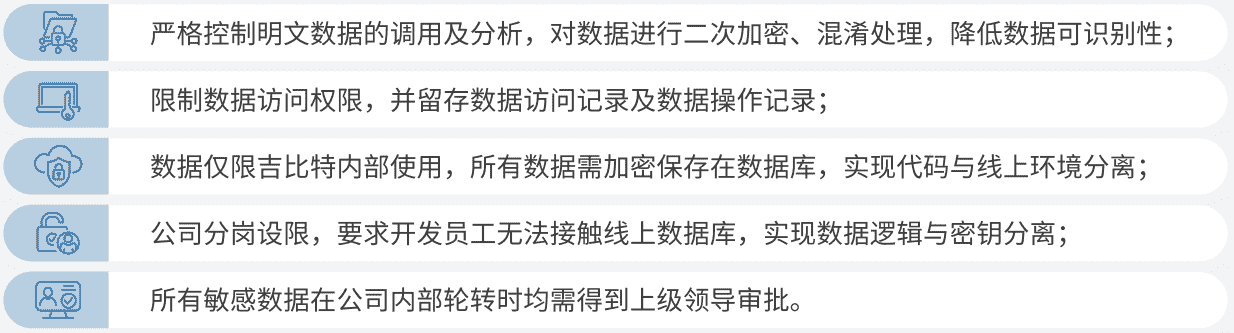 公司對用戶個人信息實施脫敏處理,,嚴格限制用戶信息用途,,數據使用完成后集中歸檔處理。。。為進一步確保數據處理過程的安全,,,公司根據實際的業務工作分崗設限,,最大程度保護數據隱私安全,,,如在生產網絡中的加密數據由研發部門員工負責編寫加、、、、解密程序,,,,但其無法直接訪問到加密后的數據庫;程序的加、、解密密鑰由運維員工單獨配置。。。。