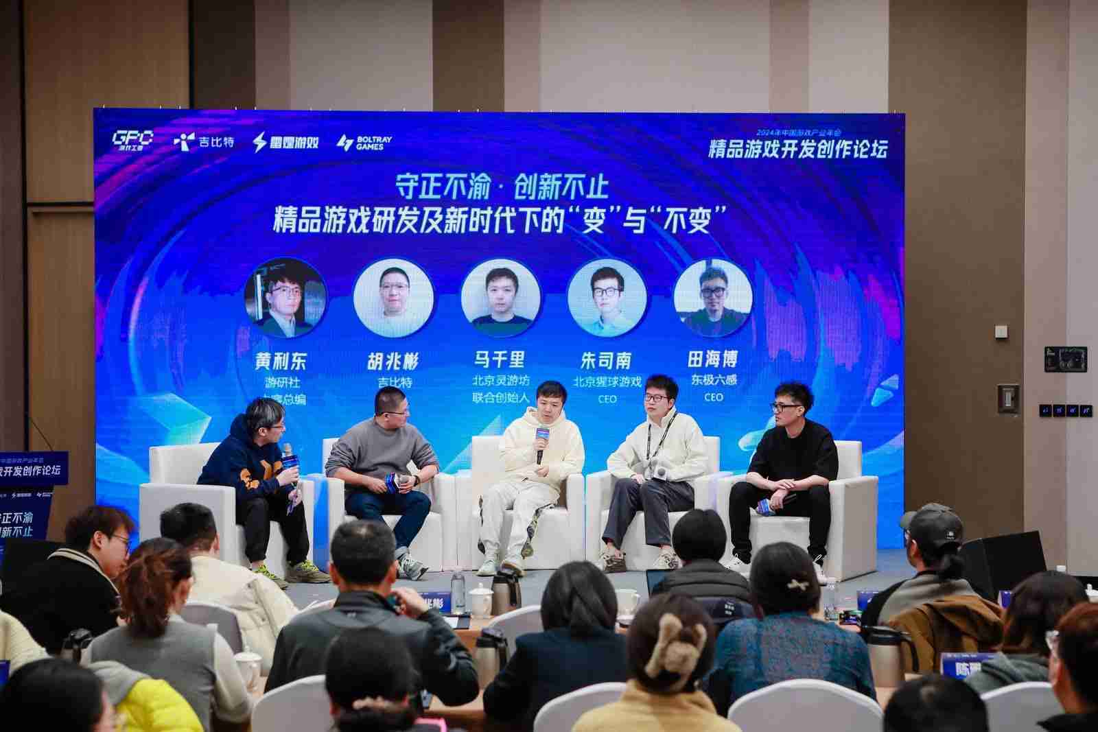 圓桌對話環節,,在游研社內容總編黃利東的主持下,,,,一競技CTO胡兆彬、、、、北京靈游坊聯合創始人馬千里、、北京猩球游戲CEO朱司南、、東極六感CEO田海博等四位嘉賓圍繞“守正不渝、、、創新不止——精品游戲研發及新時代下的‘變’與‘不變’”這一主題分享了各自在精品游戲開發理念及工程能力搭建方面的見解和經歷,,,并就行業變化下游戲人需要堅守的理念等展開交流探討。。