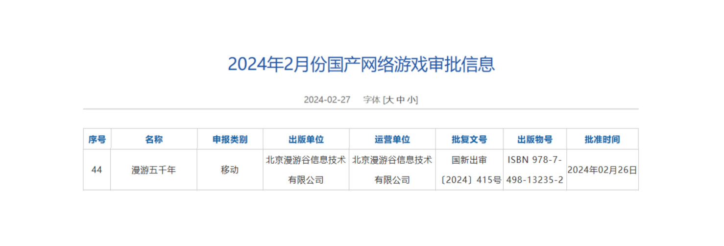 ????????2024年2月27日,,,國家新聞出版署公布了2024年2月份國產網絡游戲審批信息名單。。其中成都一競技網絡信息有限公司(簡稱“一競技”)與北京漫游谷信息技術有限公司(簡稱“游戲谷”)聯合研發的國風策略塔防+放置類手游《漫游五千年》取得版號!!!!