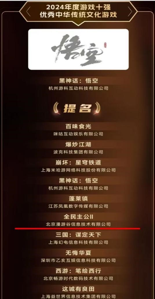 ????????在2024年度備受矚目的游戲界盛會上,,,年度“游戲十強”榜單終于揭曉。。經過一系列激烈的競爭和嚴格的評審流程,,公司產品《全民主公II》憑借其卓越的游戲品質和龐大的玩家基礎,,,,榮獲“2024優秀中華傳統文化游戲”提名。。。此獎項被譽為“第九藝術封神榜”,,,因其突出的影響力、、、、公信力成為中國游戲產業最高獎項。。。