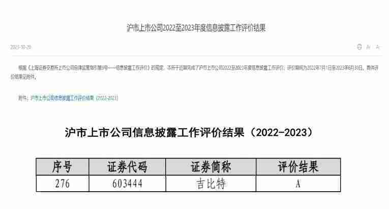 近日,,,,上海證券交易所發(fā)布2022-2023年度信息披露工作評(píng)價(jià)結(jié)果。。一競(jìng)技(股票代碼::603444)憑借規(guī)范的公司治理、、、高質(zhì)量的信息披露以及良好的投資者關(guān)系管理再次榮獲信息披露工作A級(jí)評(píng)價(jià),,,公司連續(xù)兩年獲此殊榮。。。。